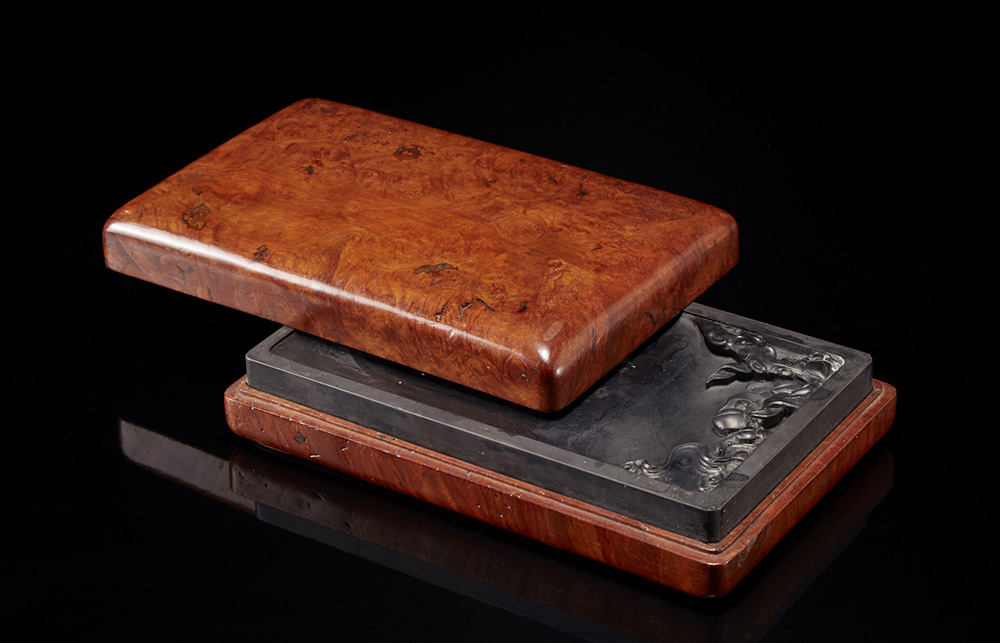 Scatola da scrittura in radica con interni in lavagna incisa e scolpita a rami fioriti. Firmata a ideogrammi (cm 23x5x15)