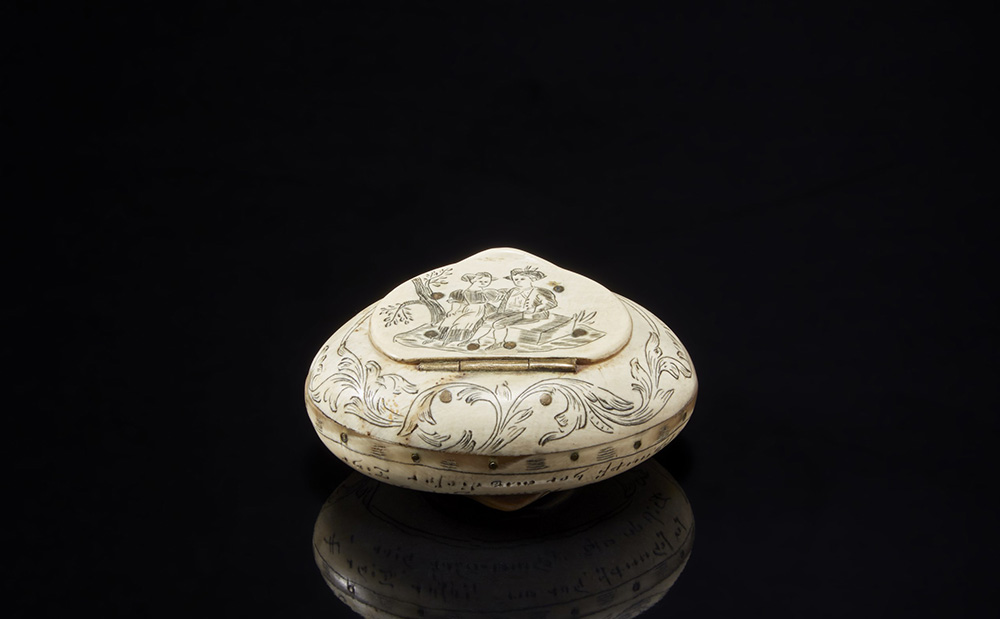 Manifattura del sec. XIX. Tabacchiera in osso incisa a volute, iscrizioni e scena galante sul coperchio