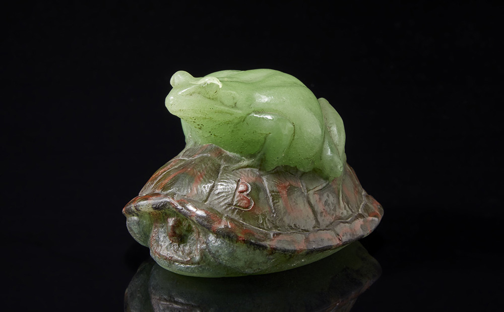 Presse-papier in pasta di vetro policroma raffigurante un rospo su carapace. Francia, inizi del sec. XX (cm 11x7x8,5) Siglata "B" (difetti)