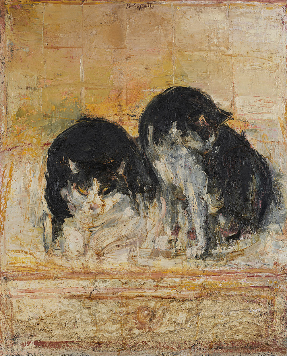 "Cats" oil on canvas. 1990 (cm 75x60) Signed at bottom centre. Dated to reverse