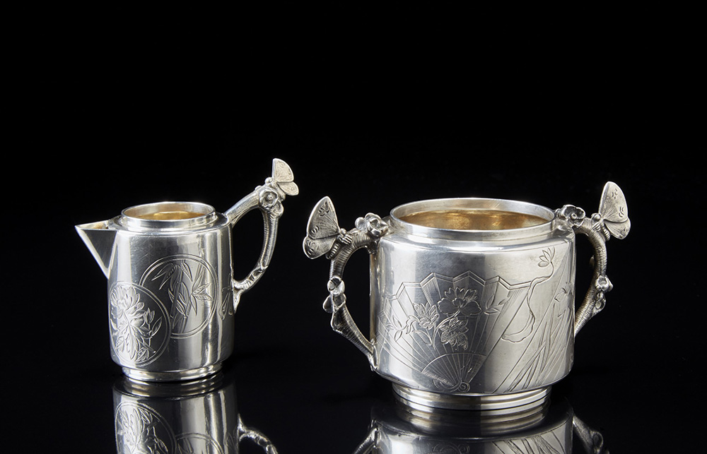Zuccheriera e lattiera in argento inciso e cesellato. Anse con farfalla. Birmingham, 1899. Argentiere Asprey & Co Ltd (h. max. cm 8 ca.) (gr 270 ca.) (mancanze)