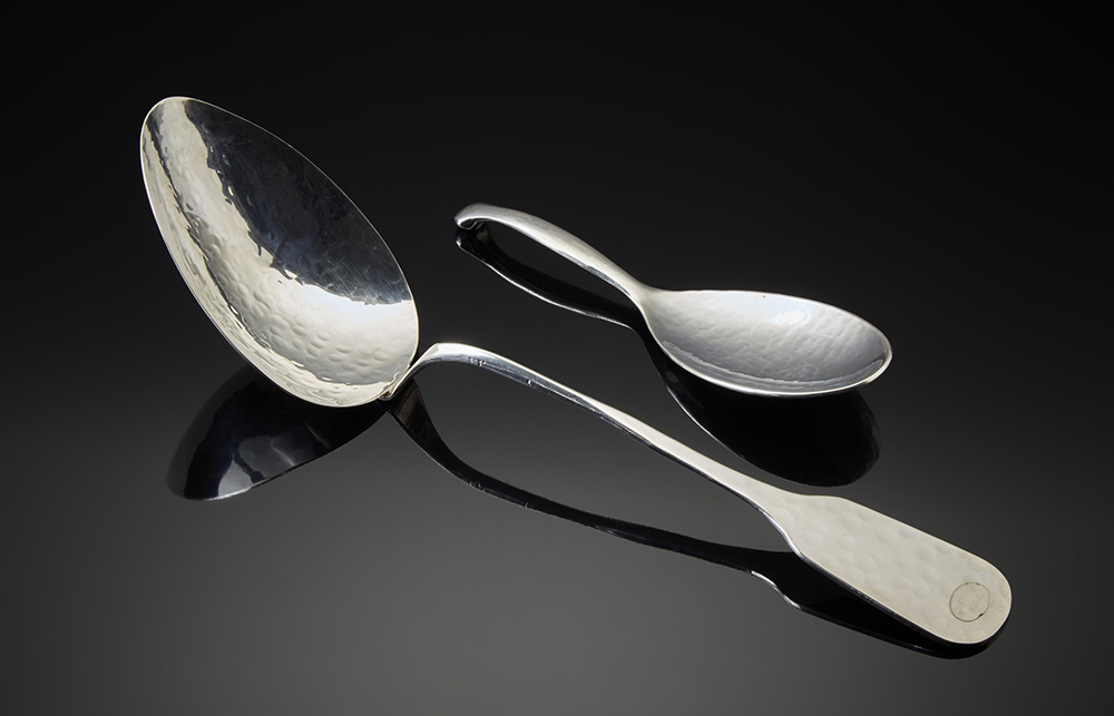 Lotto di due cucchiai in argento con superficie martelé. Italia, sec. XX. Argentiere Brandimarte (lungh. max cm 38) (gr 480 ca.)