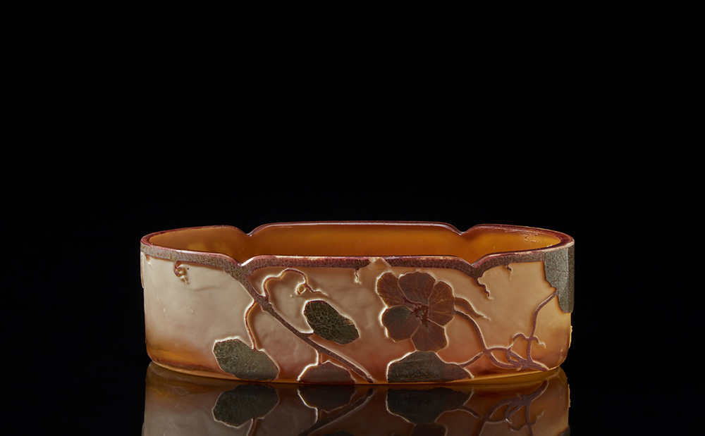Centrotavola in vetro a cammeo inciso all'acido con decori vegetali nei toni del crème, verde e rosso. Inizi del sec. XX (cm 7x24x23). Firma a cammeo (difetti)