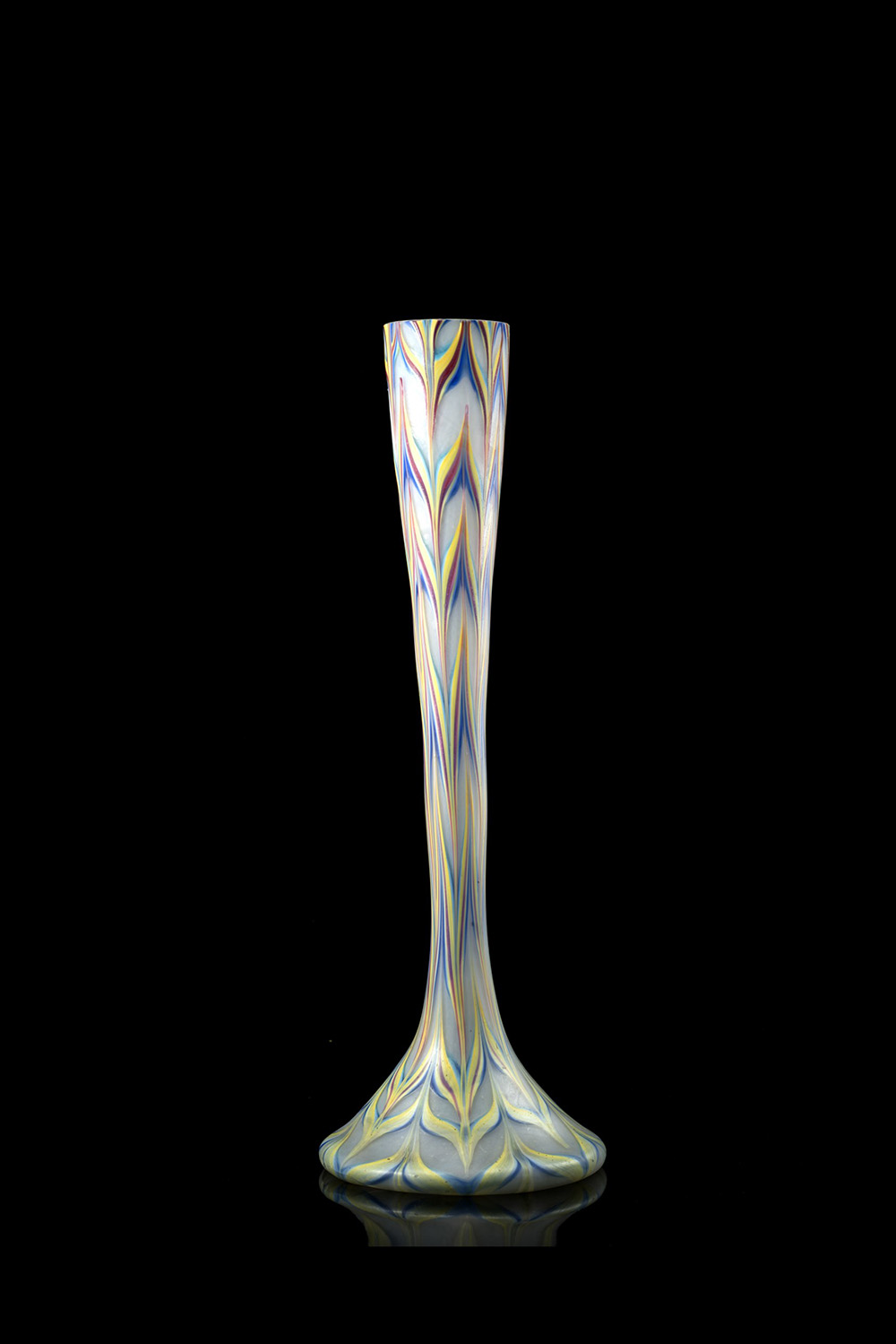 . Vaso a collo stretto svasato verso l'alto in vetro soffiato policromo con decoro "fenicio". Prima metà del sec. XX (h. cm 50) (difetti)