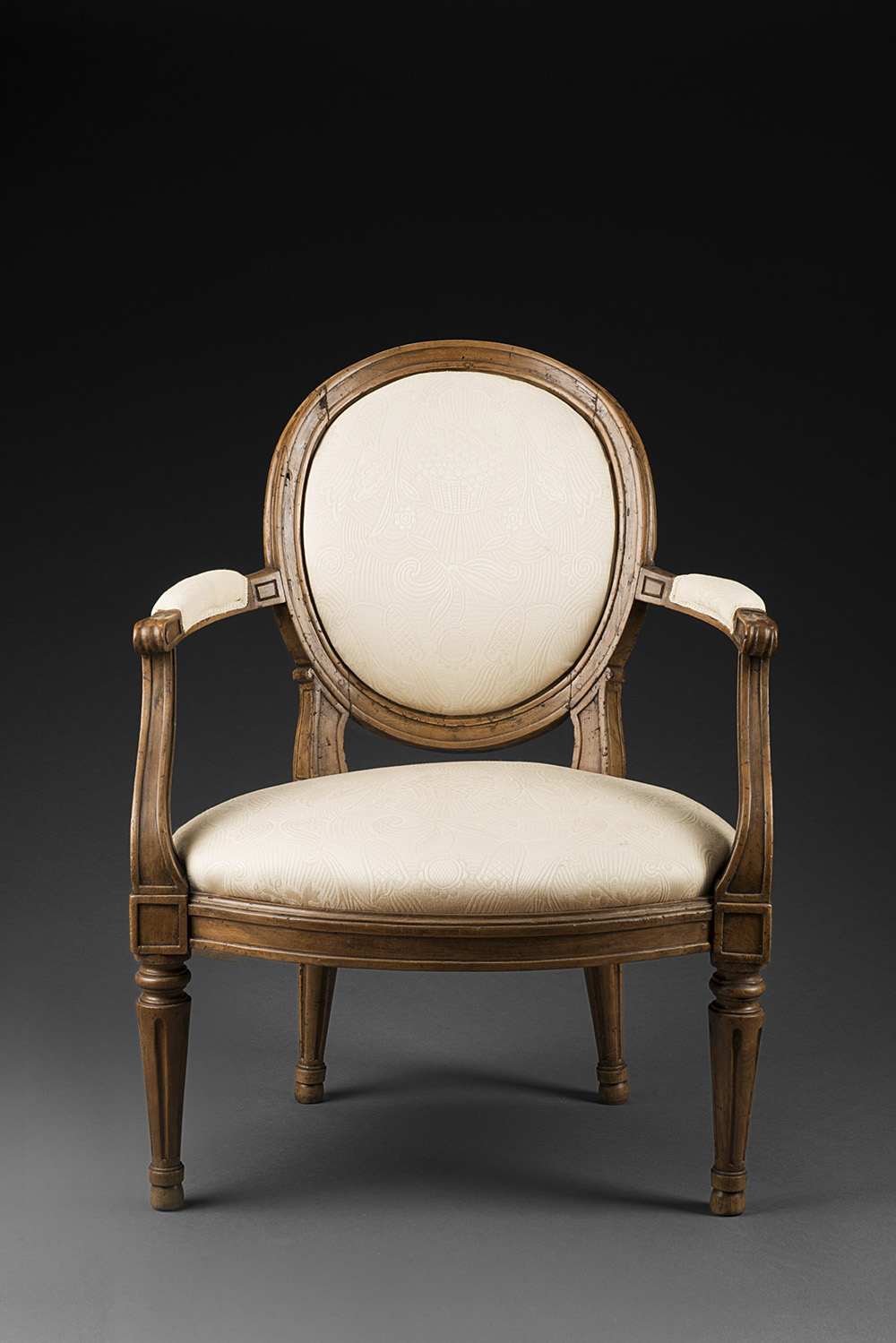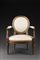 Poltroncina in rovere con braccioli sagomati e scanalati. Gambe tornite. Sec. XIX. Rivestita in tessuto bianco decorato a fiori (difetti)