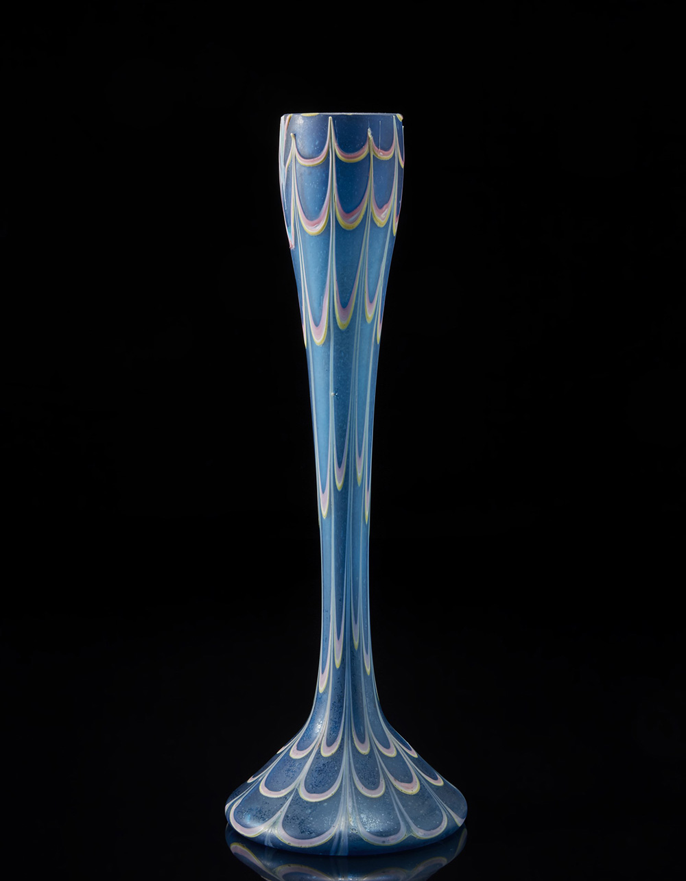 Manifattura di Murano, vaso a collo stretto svasato verso l'alto in vetro soffiato blu trasparente con decoro policromo "fenicio". Prima metà del sec. XX (h. cm 49) (lievi difetti)