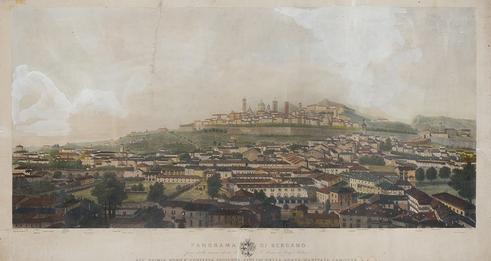 A colour engraving of the city of Bergamo, 19th century (cm 55x100) (defects)