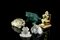 Different manufactures. Lot comprising two glass frogs and three ceramic and terracotta frogs