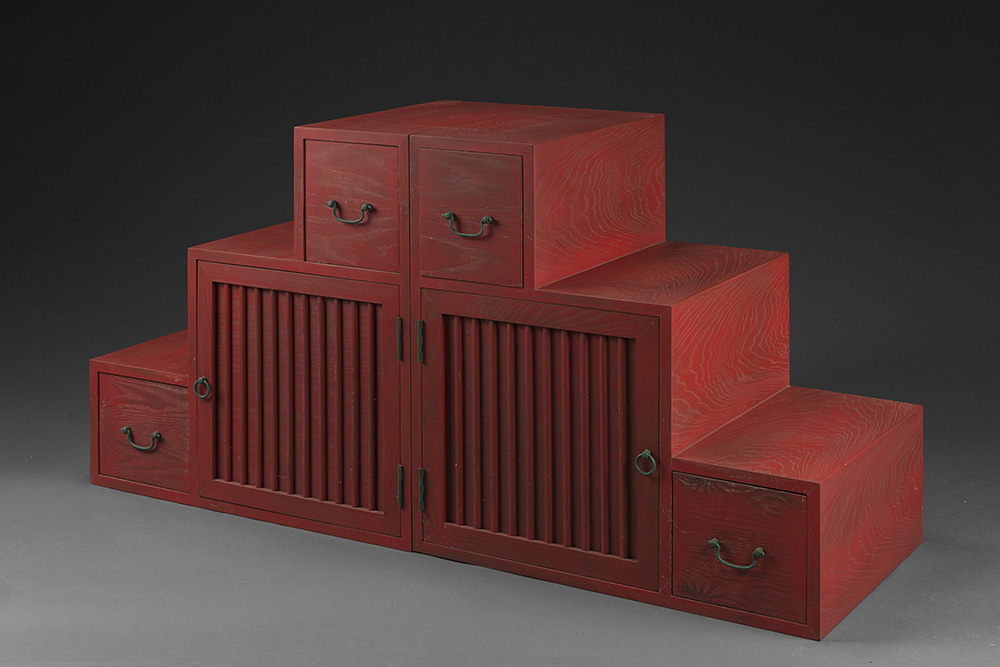 Scala da centro in legno laccato rosso a otto cassetti e due ante centrali...