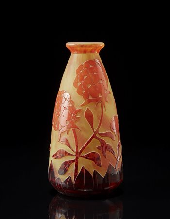 Vaso a bottiglia in vetro cammeo inciso all’acido con soggetto floreale nei toni del bruno e dell’arancio su fondo giallo-arancio. Francia, 1925 ca. (h. cm 18). Firma incisa alla base.