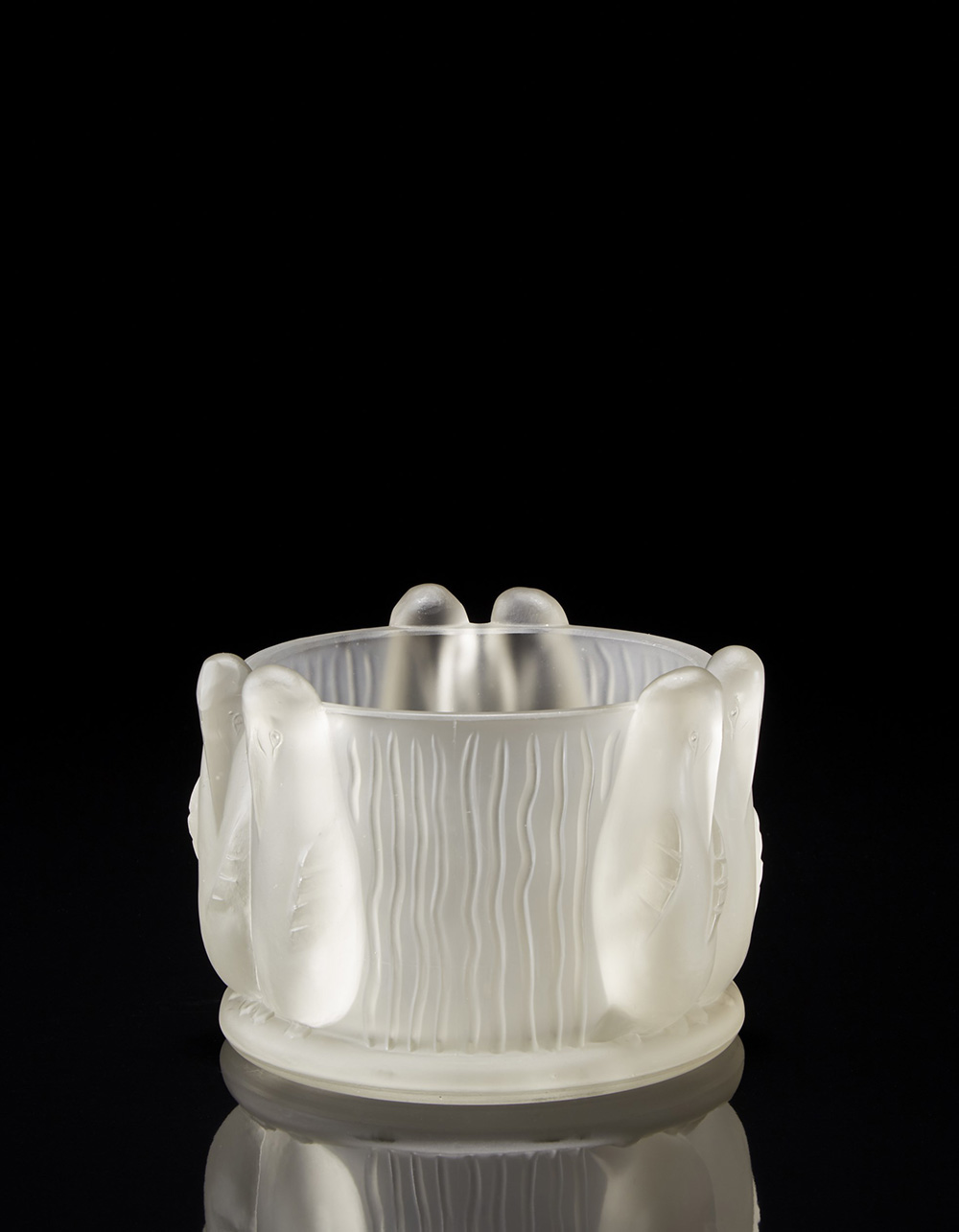 . Vaso in vetro incolore satinato decorato in rilievo a pinguini. Sec. XX (h. cm 14 x d. cm 18,5)