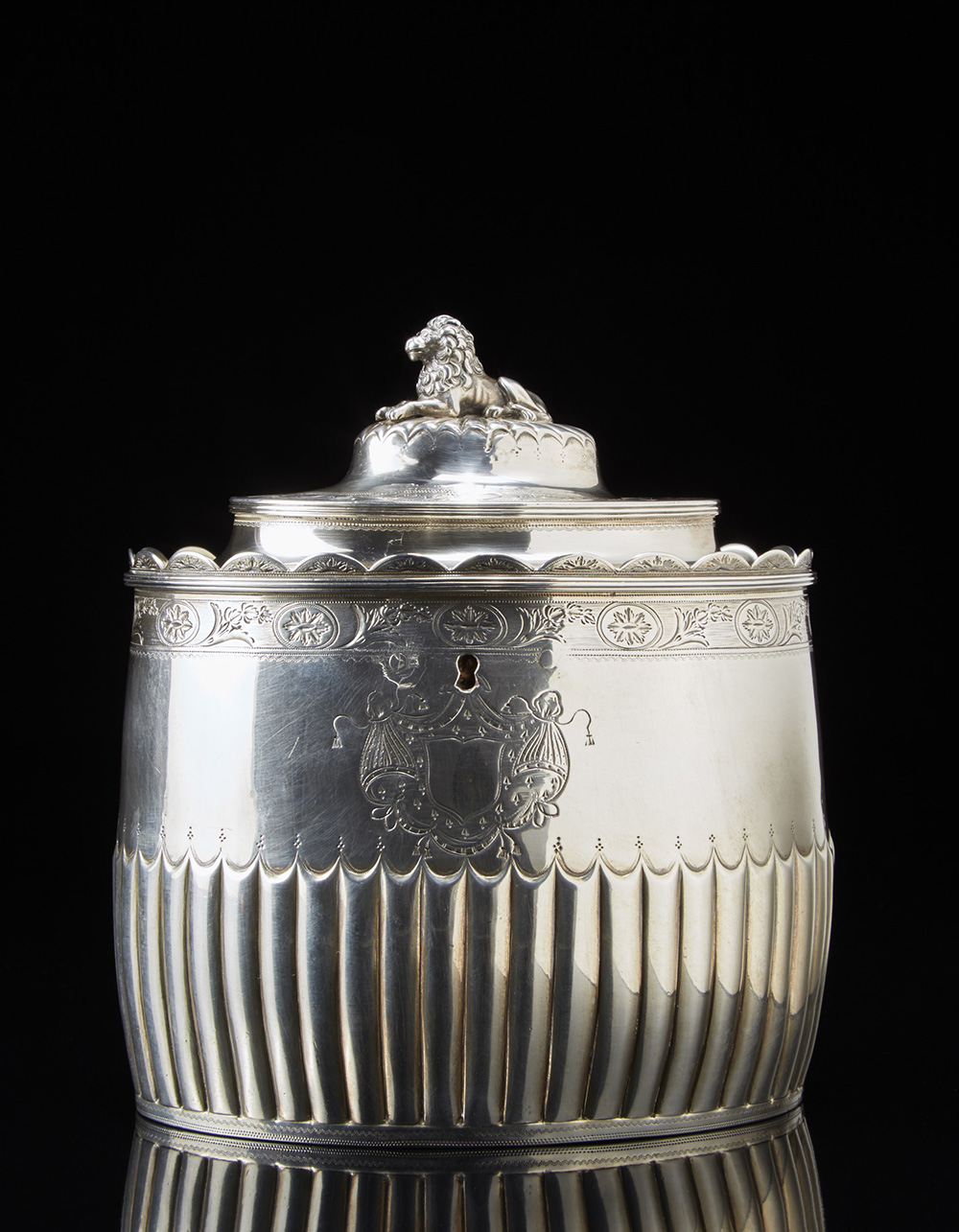Zuccheriera in argento di forma ovale decorata con fasce baccellate e incise a motivi stilizzati. Presa in figura di leone a tutto tondo. Londra, 1793, argentiere John Robins (?) (h. cm 17) (gr 670 ca.)