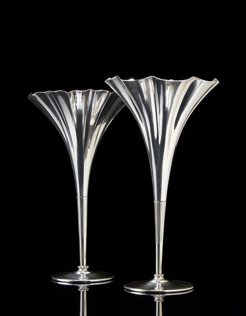 Coppia di vasi portafiori a campanule in argento con fusto scanalato. Stati Uniti, Tiffany & Co 1907-47/1891-1902 (h. cm 24) (gr 450 ca.) (difetti)