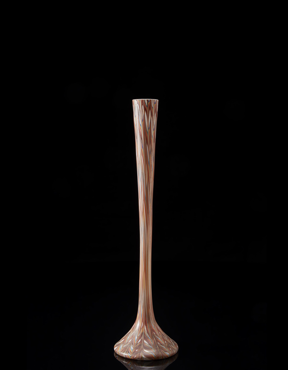 vaso a collo stretto svasato verso l'alto in vetro soffiato policromo con decoro "fenicio". Prima metà del sec. XX (h. cm 63) (difetti)