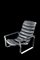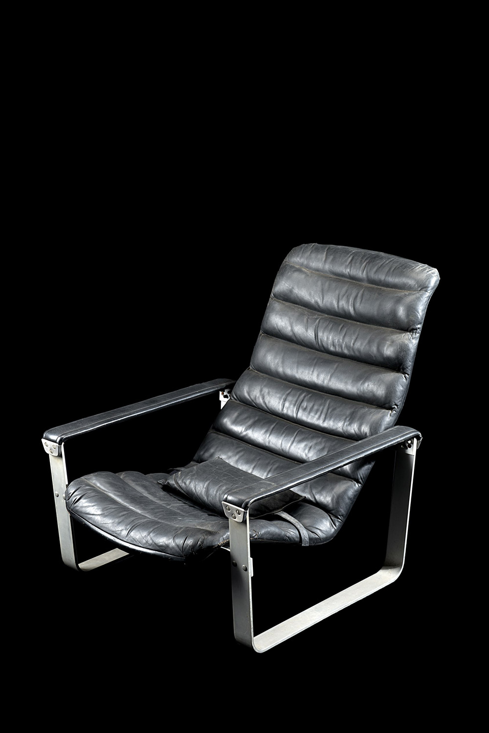 Poltrona modello "Pullka". Produzione Asko, Finlandia, 1968 ca. Alluminio, seduta e braccioli rivestiti in pelle nera (cm 76x98) (difetti)