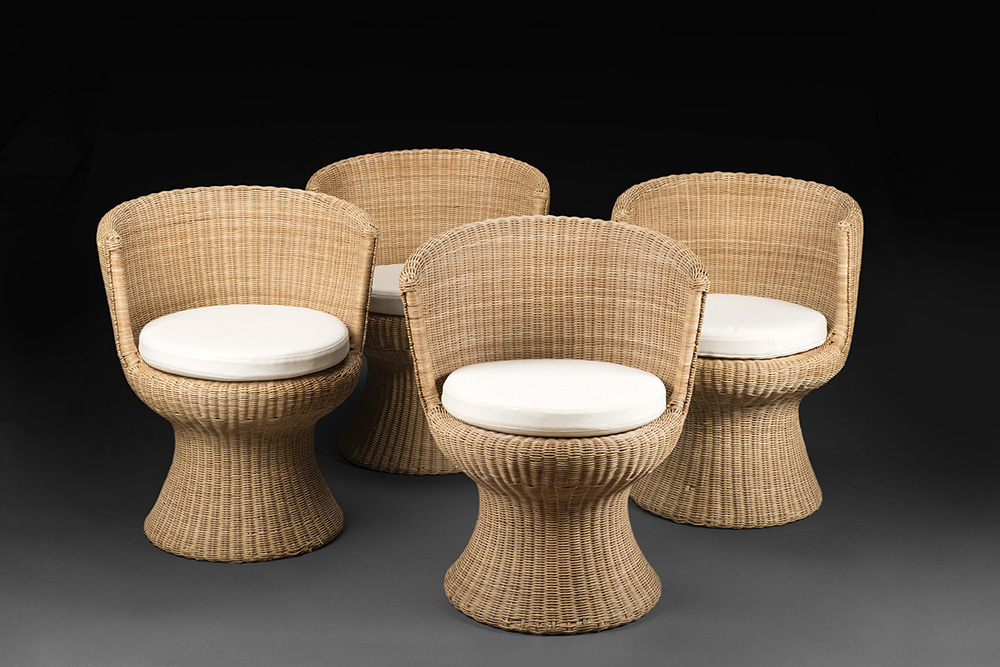 Gruppo di otto poltroncine a pozzetto in vimini intrecciato (difetti)