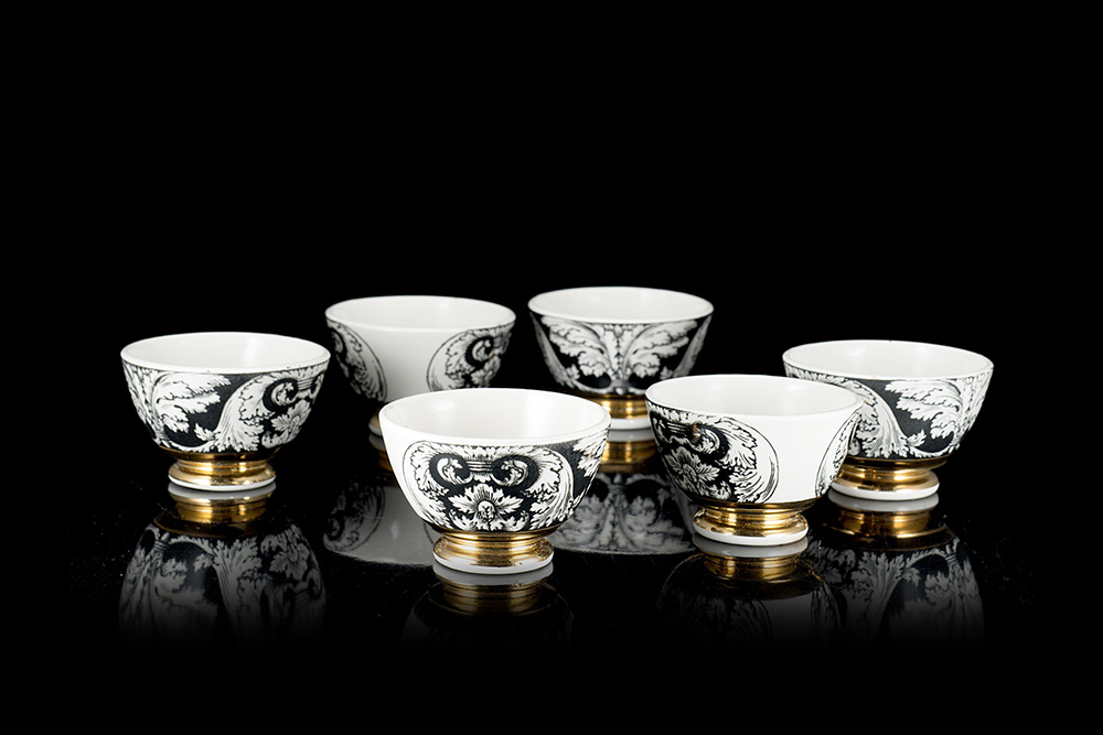 Gruppo di sei tazzine in ceramica decorate a foglie d'acanto. Seconda metà del sec. XX.