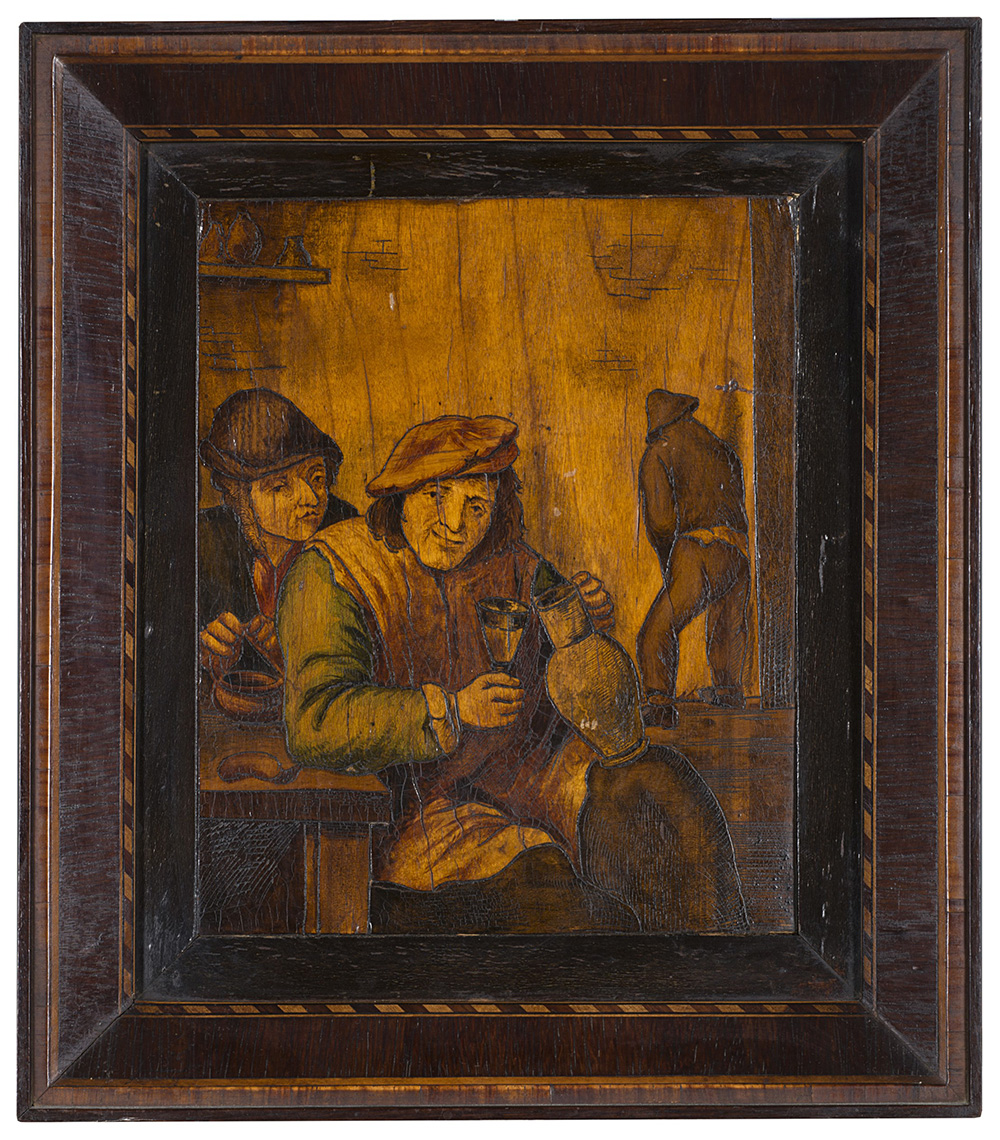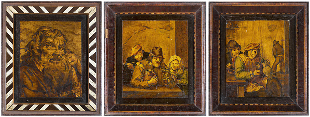 Lot 1064 | Gruppo di tre pannelli in legno intarsiato a scene di osteria e ritratto (cm...