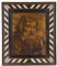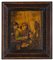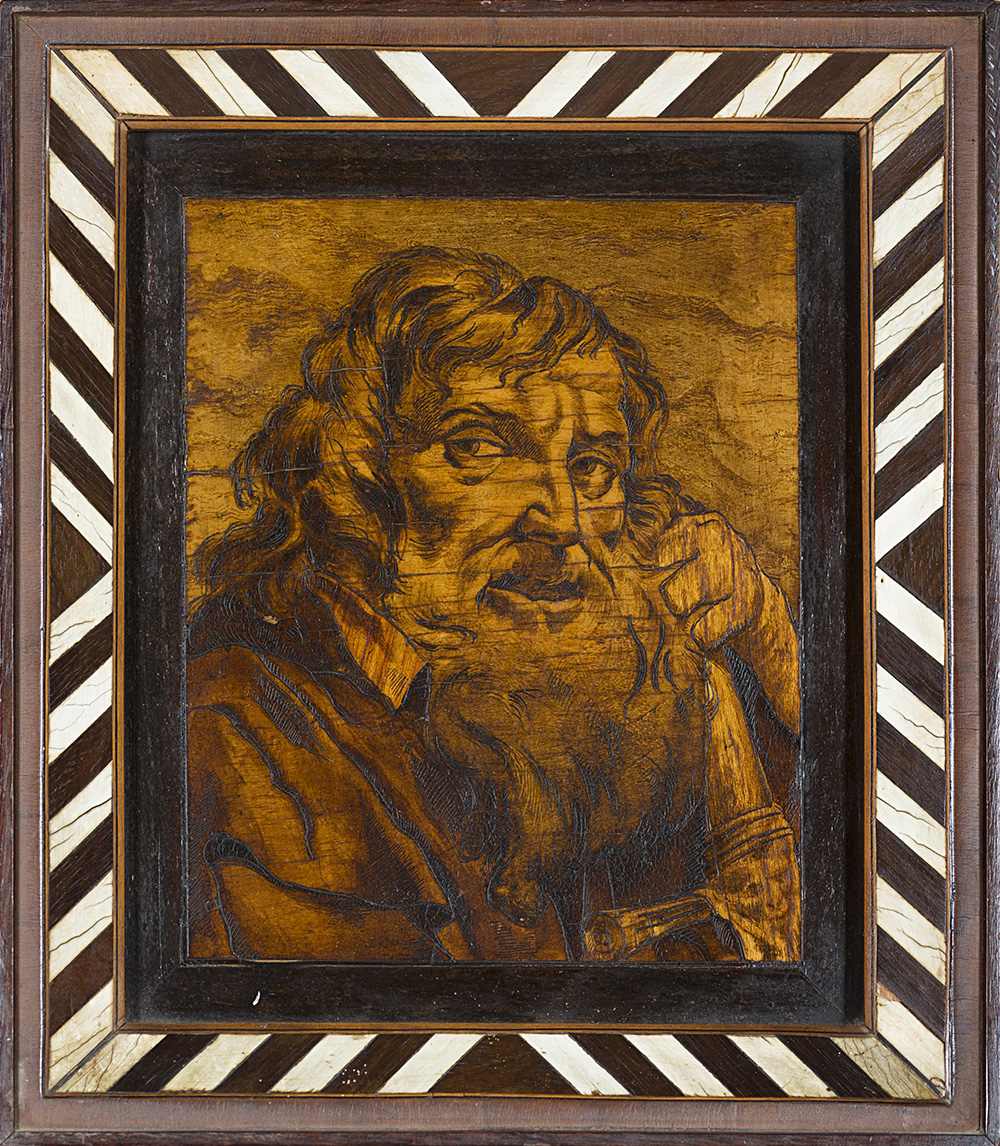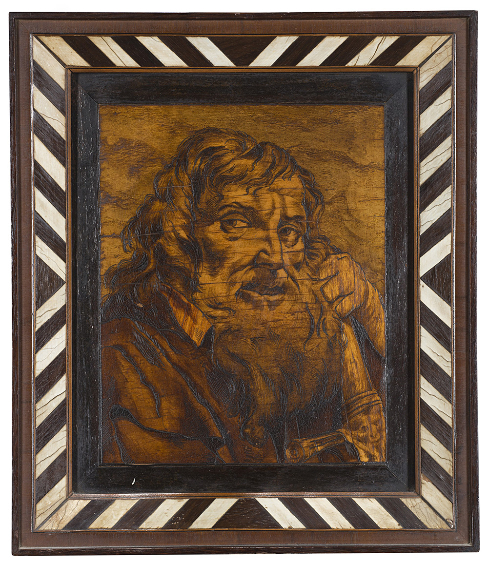 Gruppo di tre pannelli in legno intarsiato a scene di osteria e ritratto (cm 21x17) In cornici filettate e intasiate in osso e legni vari