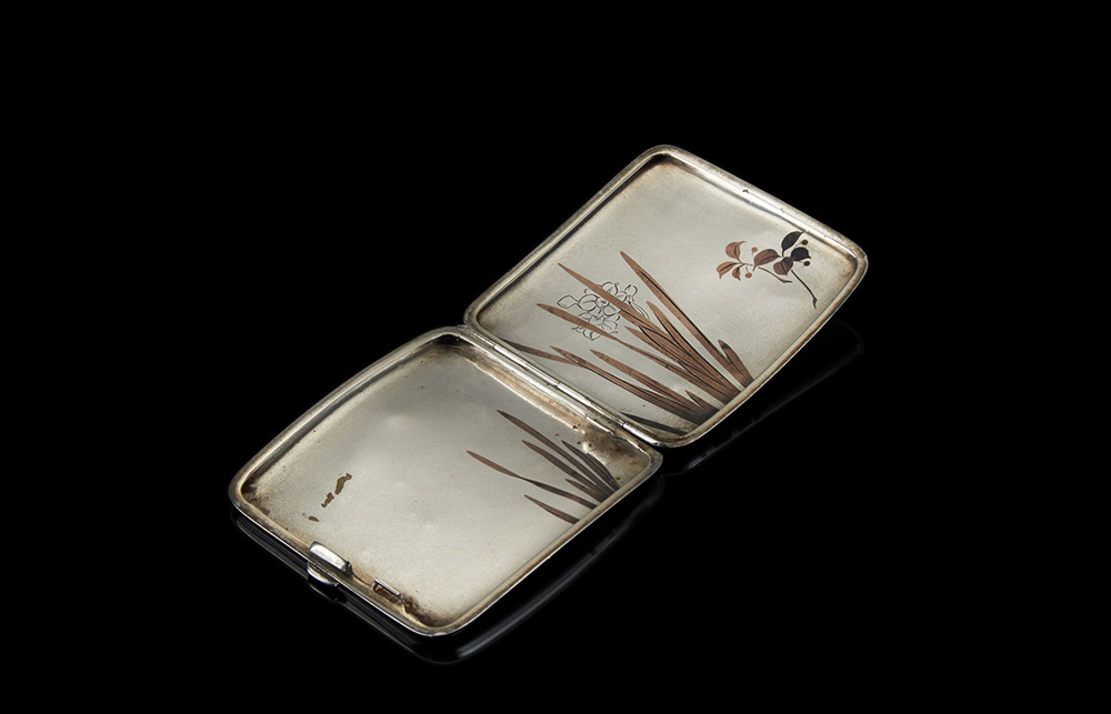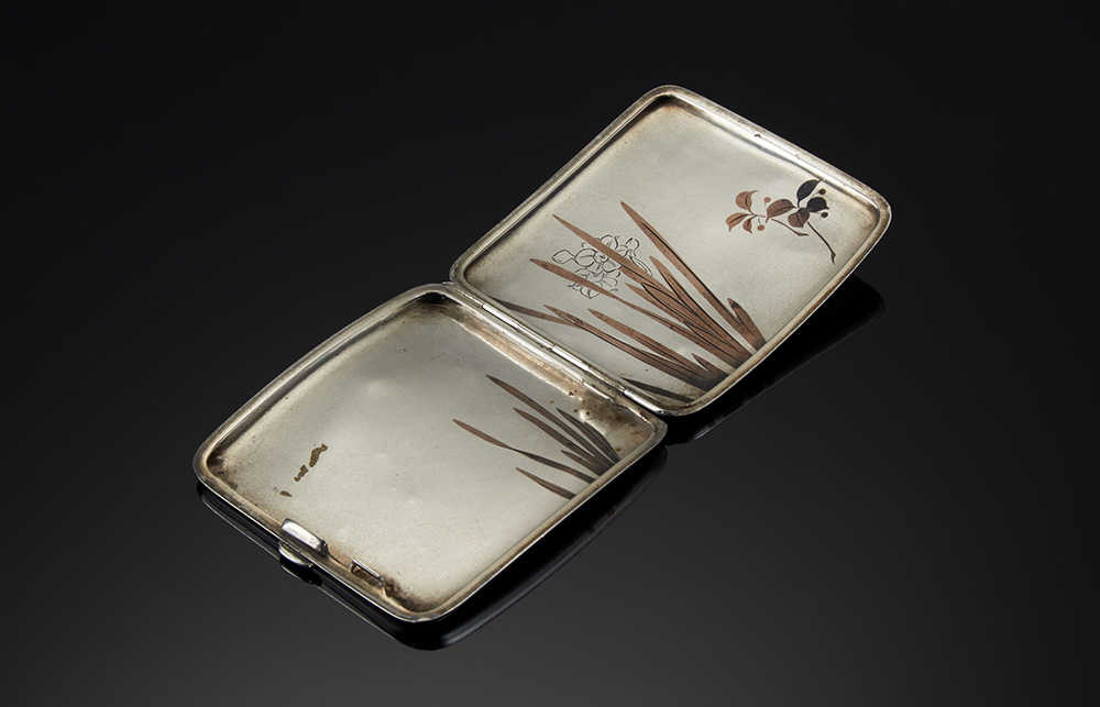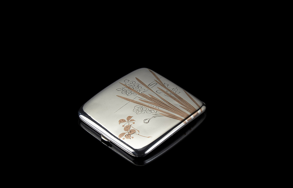 Portasigarette in argento e rame a corpo liscio inciso e decorato a motivi vegetali. Giappone (?), sec. XX (cm 8,5x8) (difetti)