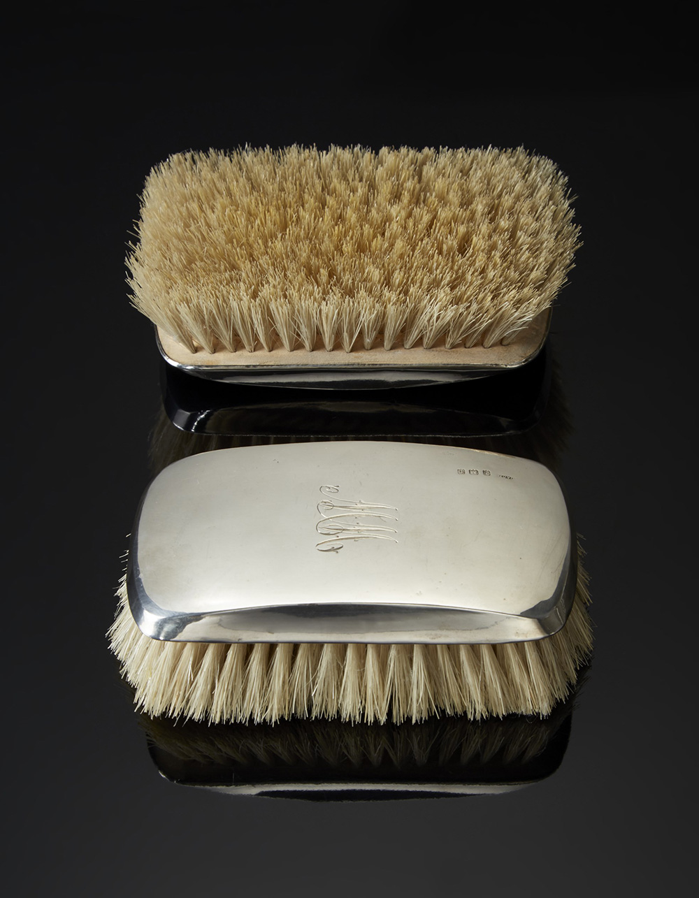 Coppia di spazzole in argento cifrate "MM". Birmingham, 1918 (cm 12x6,5) (difetti)