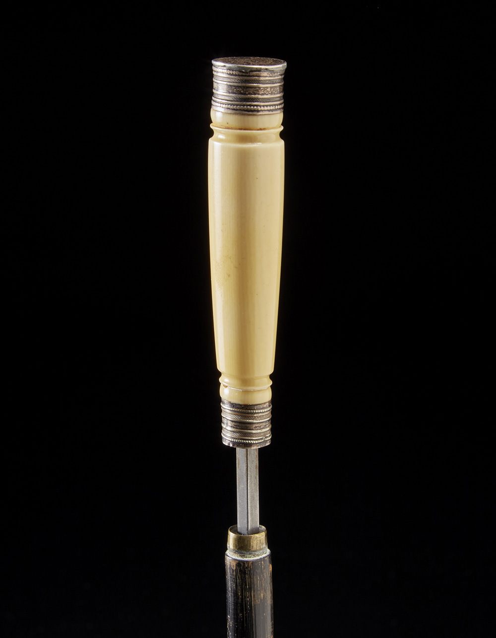 Bastone da passeggio animato in bambù tinto nero con presa dello stiletto in avorio con ghiere in metallo argentato. Sec. XIX