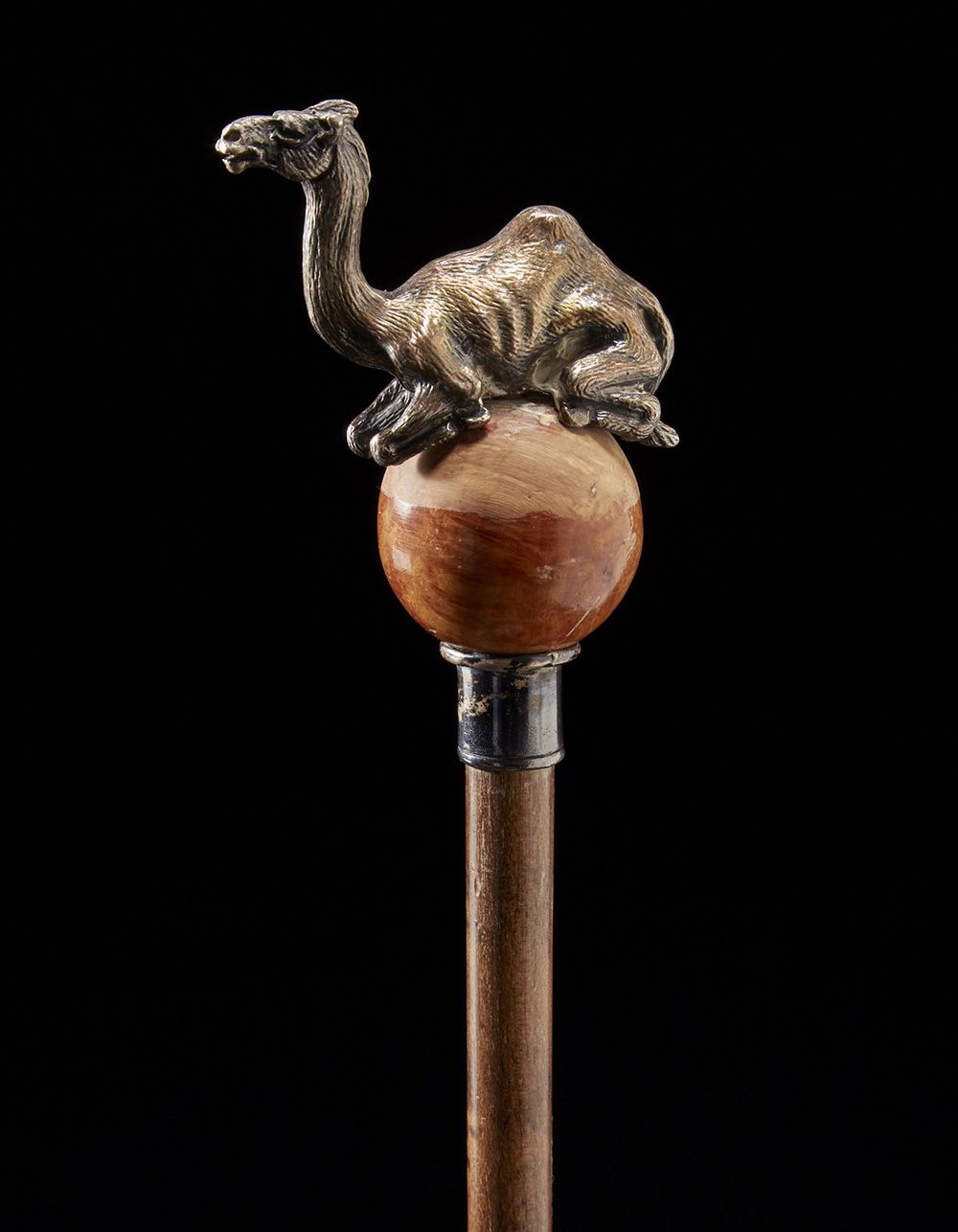 Bastone da passeggio in legno con pomolo a forma di cammello a tutto tondo e ghiera in argento. Inizio sec. XX (difetti)
