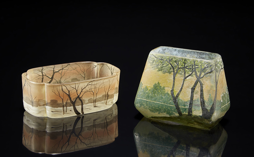 Legras, Gauthier. Lotto di due vasetti, uno dipinto l'altro in vetro cammeo. Francia, primo quarto del sec XX