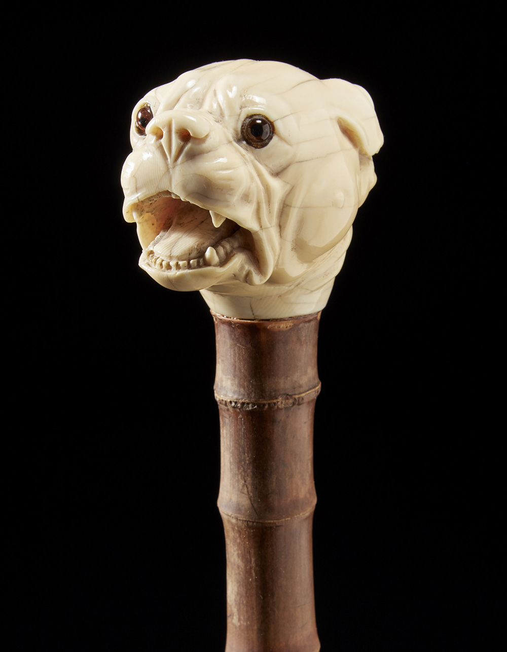 Bastone da passeggio in bambù con presa in avorio scolpito a tutto tondo a testa di cane con occhi in pasta vitrea. Sec. XIX (difetti e mancanze)