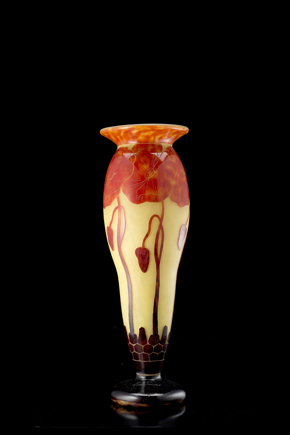 Vaso in vetro cammeo inciso all’acido con soggetto floreale nei toni del bruno e dell’arancio su fondo giallo. Francia 1925 ca. (h. cm 57). Firma incisa alla base.