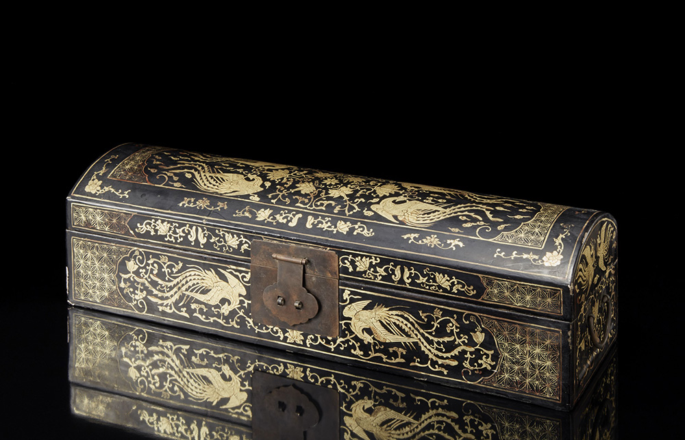 Manifattura orientale. Scatola in lacca decorata a dorature a fenici e fiori. Anse e chiusura in metallo (cm 66x20x30)