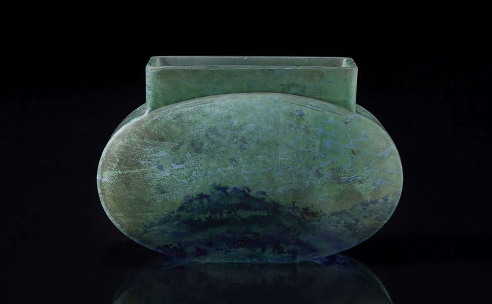 Vaso con collo squadrato in pasta vitrea nei toni del blu, verde e celeste. Inizi del sec. XX (h. cm 12) Firma incisa.