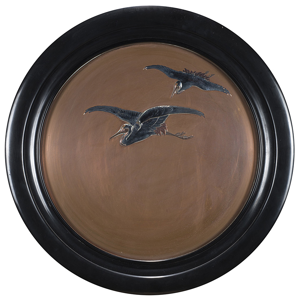 Placca circolare in rame e metallo argentato con gru in volo (d. cm 29) In cornice. Giappone, sec. XX (difetti)