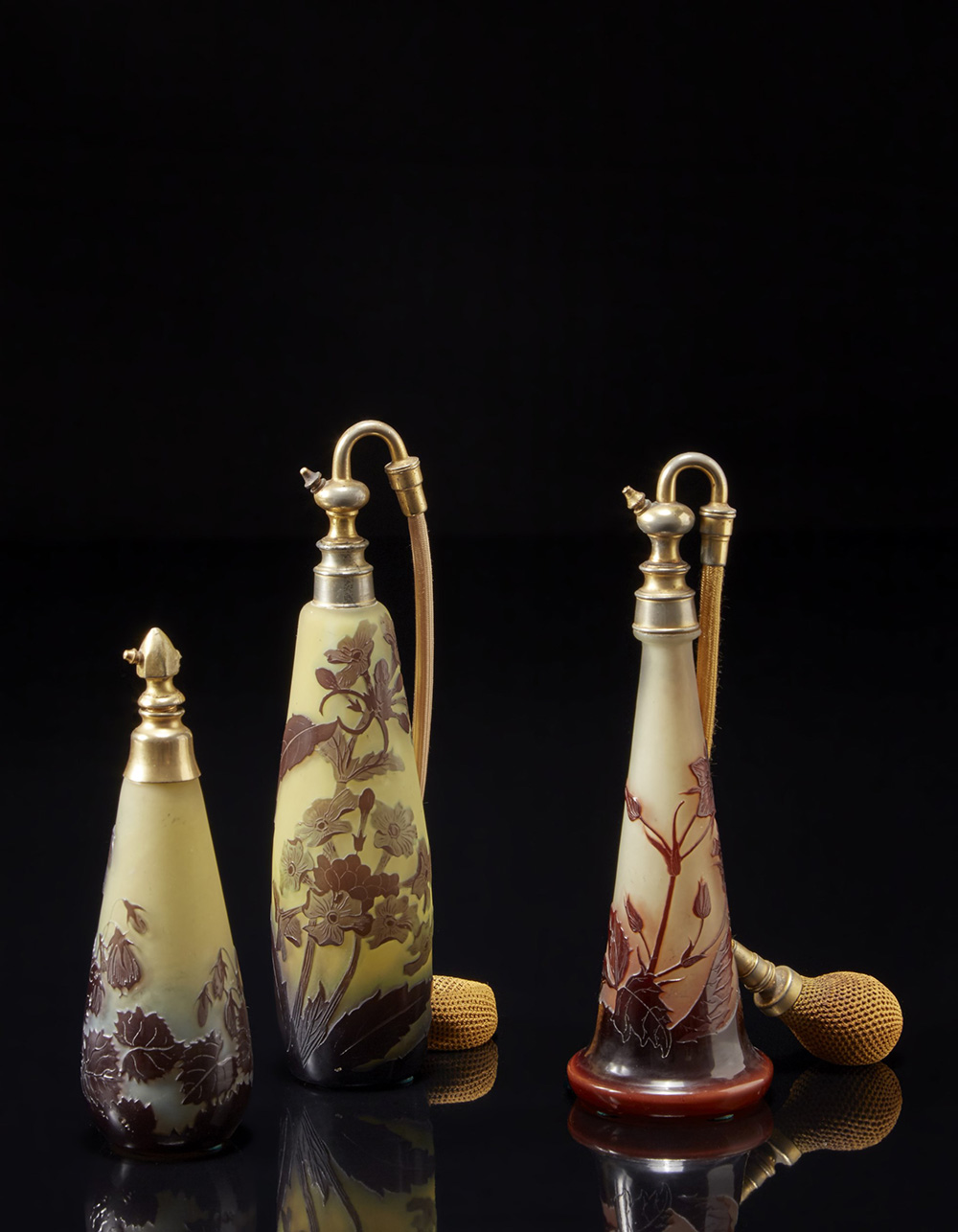 Gallé, Nancy Gruppo di tre vaporizzatori porta profumo in vetro a cammeo con...
