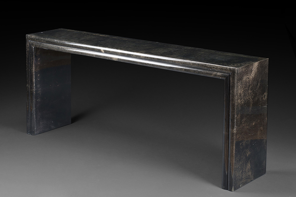 Consolle di forma squadrata in legno rivestito di pergamena colorata e verniciata al poliestere. Anni 80 ca. (cm 170x70x38) (difetti)