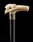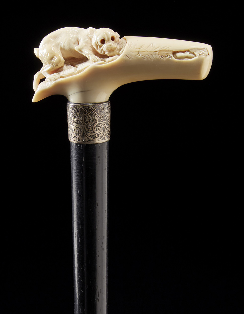 Bastone da passeggio in legno ebanizzato con presa in avorio scolpito a forma di cane su ramo. Birmingham, 1894
