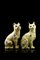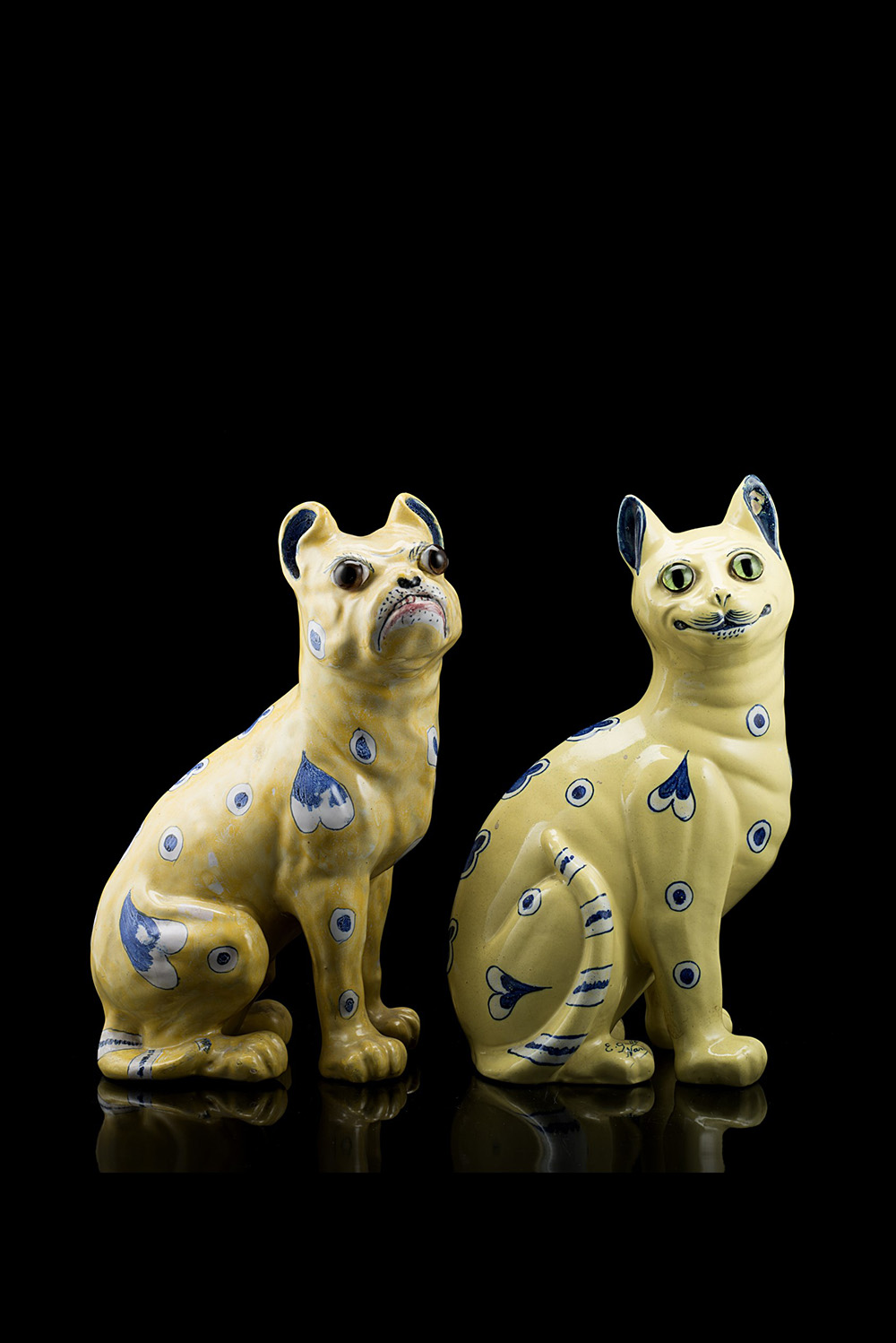 Lotto di due sculture di ceramica smaltata raffiguranti rispettivamente un cane e un gatto. Occhi in vetro applicati, con corpo decorato a cuori e cerchi blu e bianchi su fondo giallo. Il gatto reca firma "E. Gallé Nancy" sulla zampa posteriore destra, il cane reca il monogramma "GR", Gallé-Reinemer sulla zampa posteriore sinistra (h. cm 33)