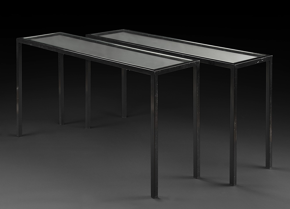 Coppia di consolles con struttura in metallo laccato nero e piano in vetro...