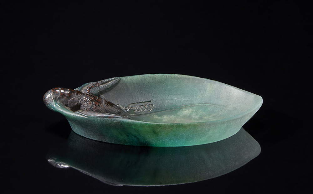 Svuotatasche in pasta di vetro policroma decorato con aragosta. Nancy, inizi del sec. XX (cm 17x3x10)