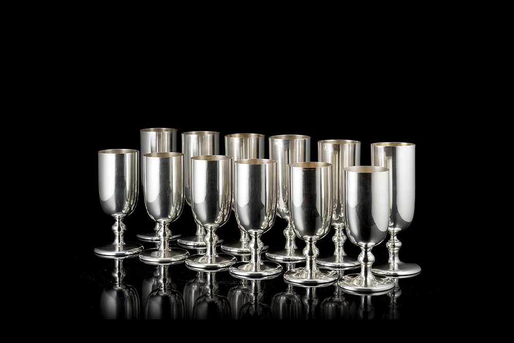Servizio composto da dodici bicchieri da acqua e dodici bicchieri da vino in argento a corpo liscio, con interno in vermeille. Milano, Argentiere Miracoli (h. cm 13,5; h. cm 15,5) (gr 2500 ca.)