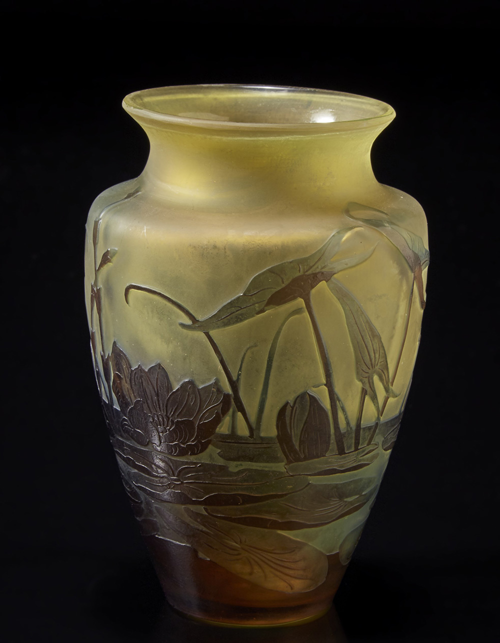 Piccolo vasetto in vetro a cammeo inciso all'acido con decori raffiguranti lo stagno nei toni del bruno e del verde trasparente. Inizi del sec. XX (h. cm 13). Firmato a cammeo "Gallé"