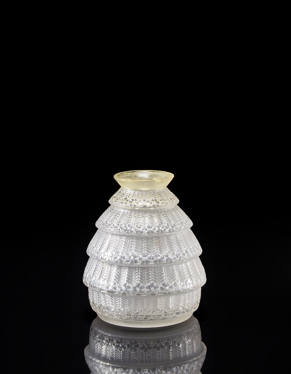 A "Ferrières" or "Cinq rangs de fleurs" glass vase. Designed 1929, realised before 1947 (h. cm 17) Signed "R. LALIQUE FRANCE" and "R. Lalique France"