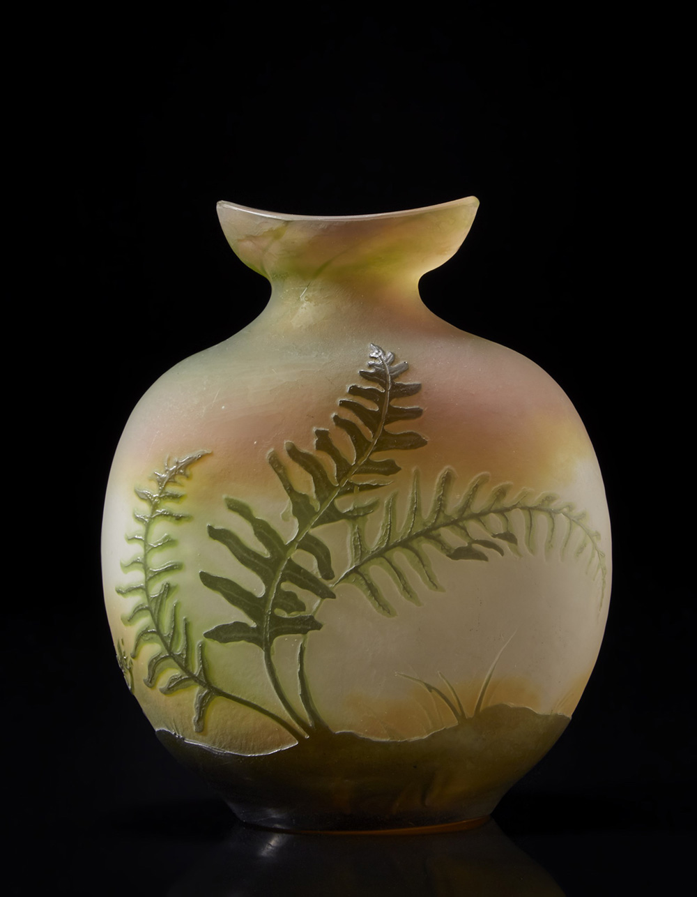 Vaso con corpo schiacciato in vetro a cammeo opalescente nei toni del giallo, dell’arancio e del verde con decori vegetali incisi all'acido. Inizi del sec. XX (h. cm 21). Firmato a cammeo "Gallé"