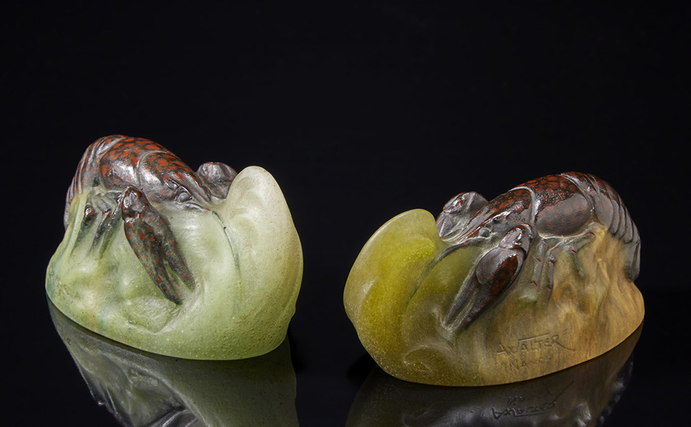Lotto composto da due sculture in pasta di vetro policroma a forma di aragoste. Nancy, inizi del sec. XX (cm 11,5x5x5,5) (lievi difetti)