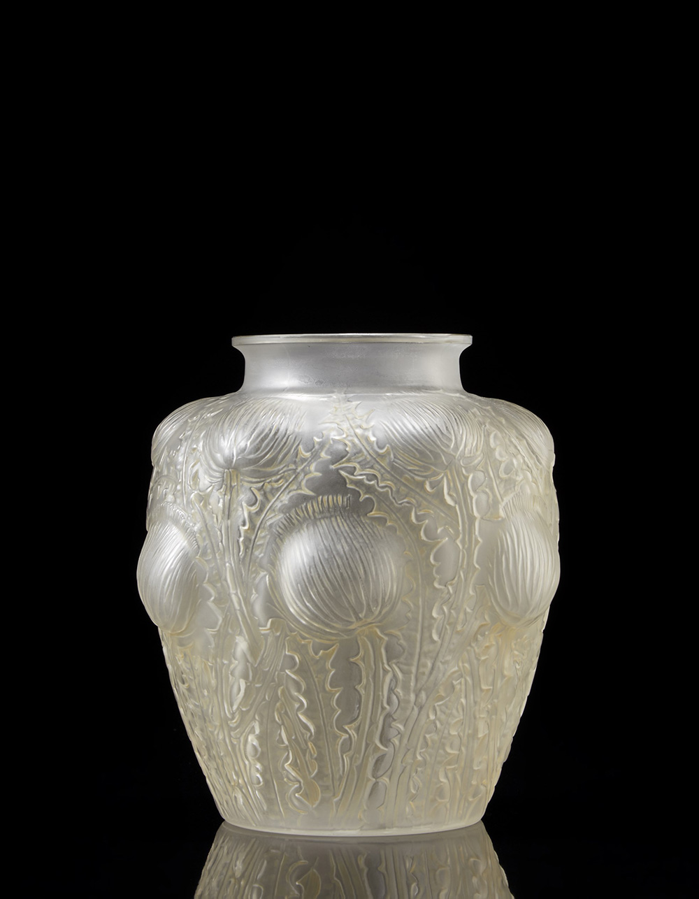 Vaso in vetro opalescente soffiato in stampo e molato e patinato modello "Domrémy", detto anche vaso "Chardons". Disegno del 1926, esecuzione ante 1947 (h. cm 22). Firmato alla piccola mola in corsivo "R. Lalique France" alla base.