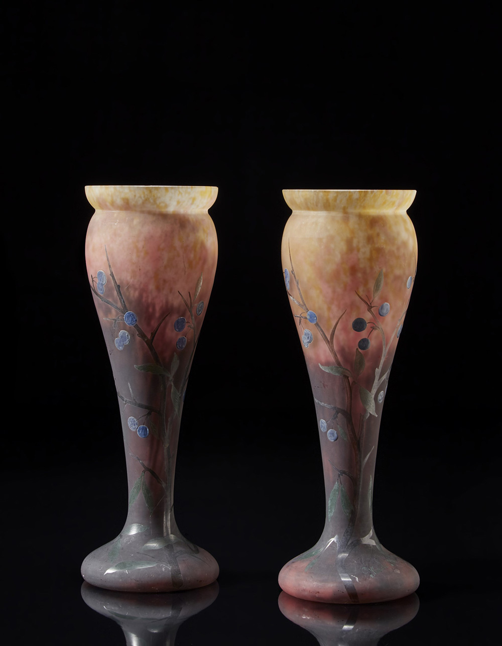Coppia di vasi in vetro cammeo nei toni del bruno, rosa e arancio, decorati a smalto sulla superficie esterna con bacche e foglie. Inizi del sec. XX (h. cm 32). Firmati alla base (lievi difetti)