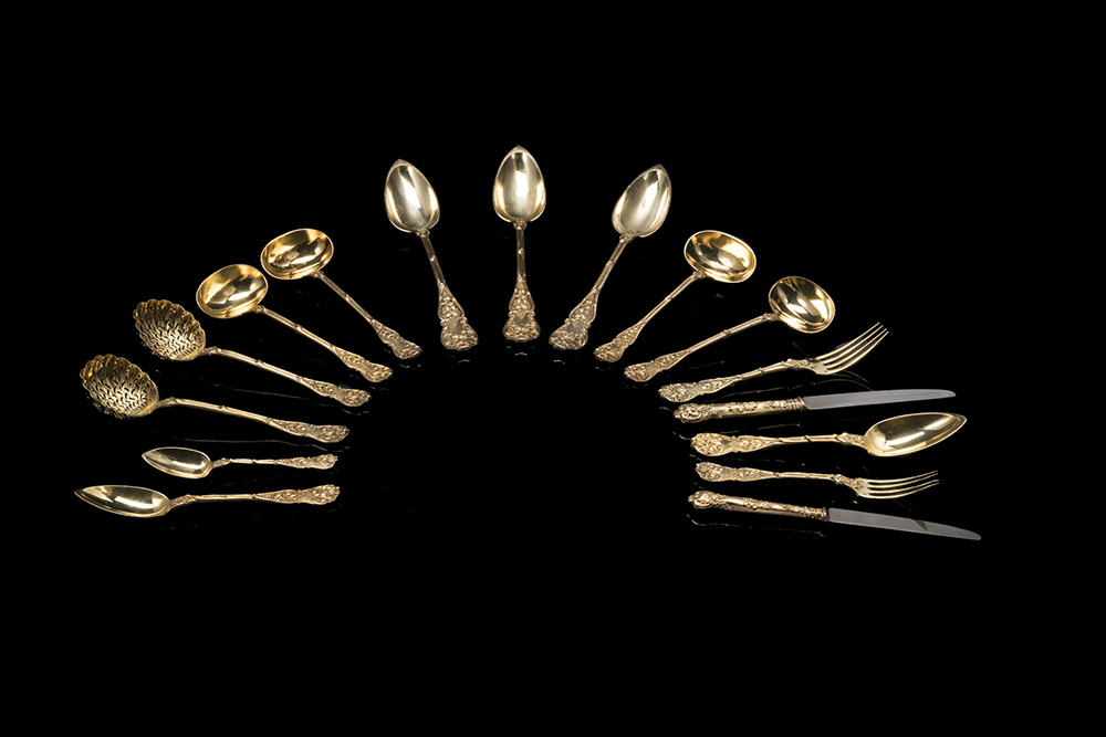 Servizio di posate similari in argento dorato decorate a motivi naturalistici composto da: ventiquattro forchette, ventiquattro coltelli, dodici cucchiai, ventiquattro forchette da frutta, ventiquattro coltelli da frutta, ventiquattro cucchiai da frutta, ventiquattro cucchiaini da thè e nove posate a servire. Francia, sec. XIX e Inghilterra sec. XX. Marchio Minerva. In custodia (gr 10200 ca.) (custodia con gravi difetti)