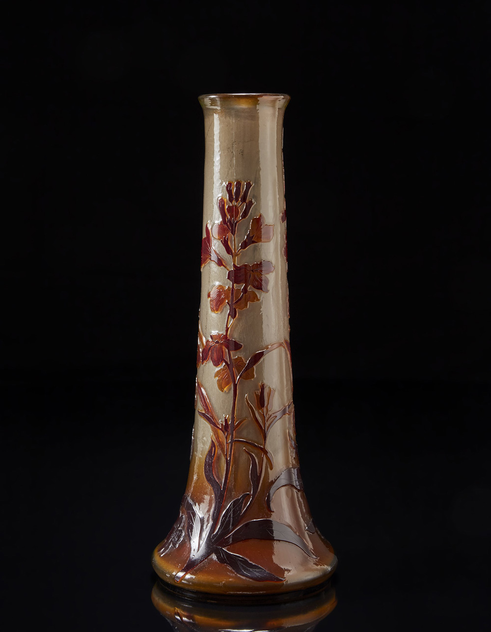 Vaso di forma cilindrica strombata verso la base in vetro a cammeo inciso all'acido con decori floreali nei toni del bruno/arancione su fondo lattescente. Inizi del sec. XX (h. cm 48). Firmato a cammeo "E Gallé" su una foglia (lievi difetti)