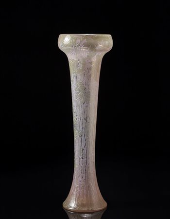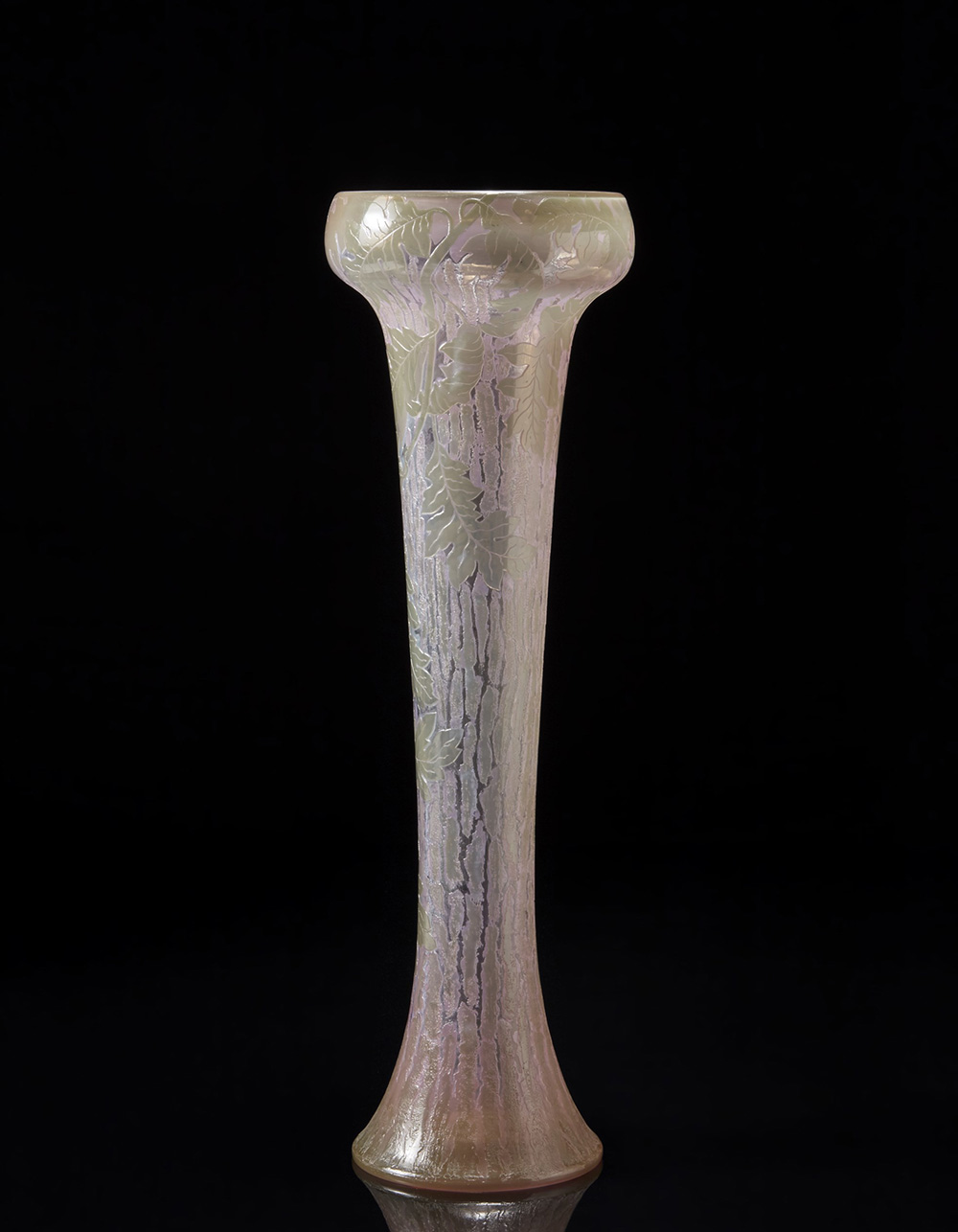 Vaso a collo alto in vetro trasparente a cammeo inciso all'acido con decoro a foglie nei toni del rosa e del verde. Inizi del sec. XX (h. cm 64). Firma incisa sotto la base.