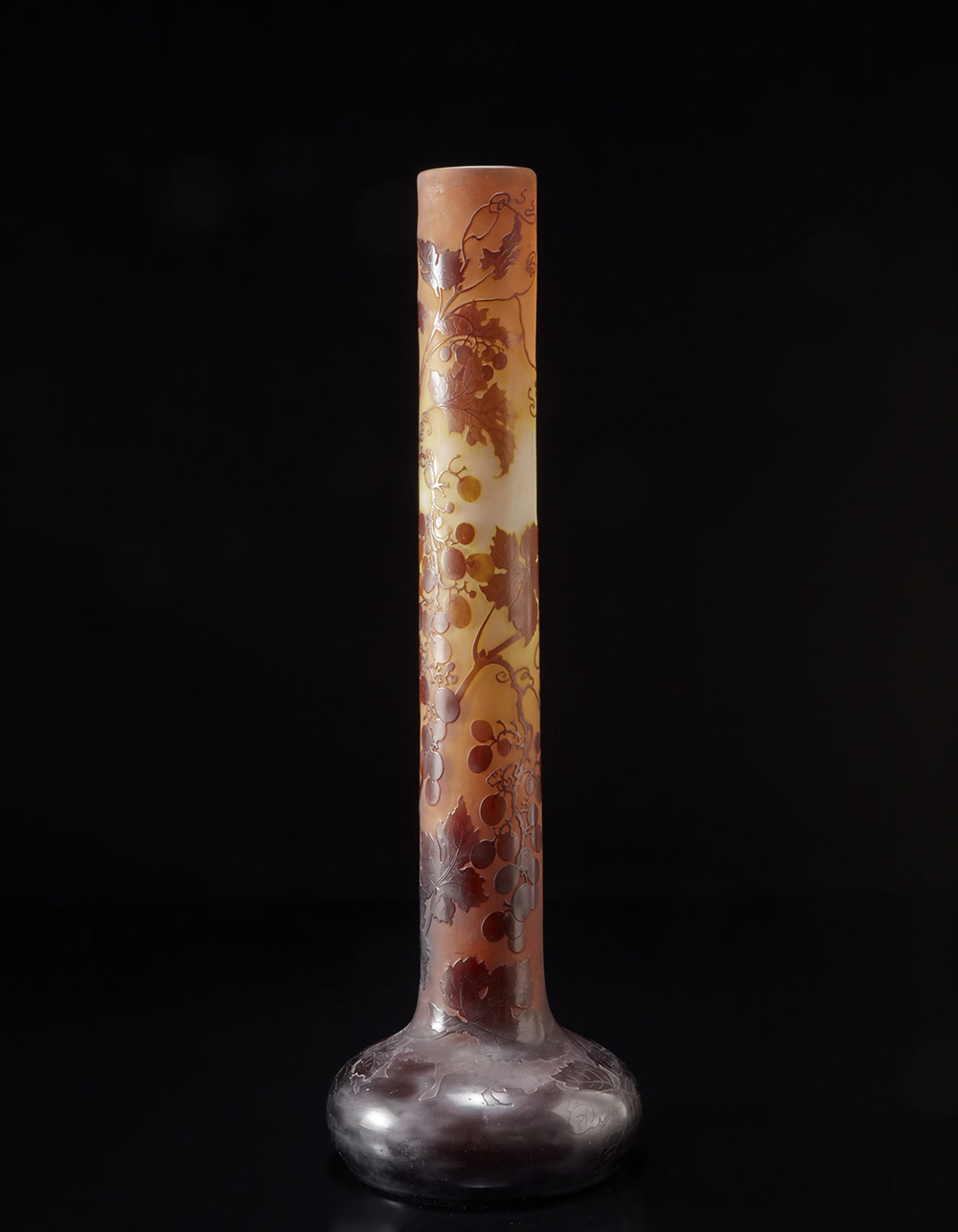 Vaso bulbiforme in vetro lattescente a cammeo inciso all'acido nei toni del giallo, bruno, rosso e rosa, decorato a foglie di vite e grappoli d'uva. Inizi del sec. XX (h. cm 76). Firmato a cammeo "Gallé"